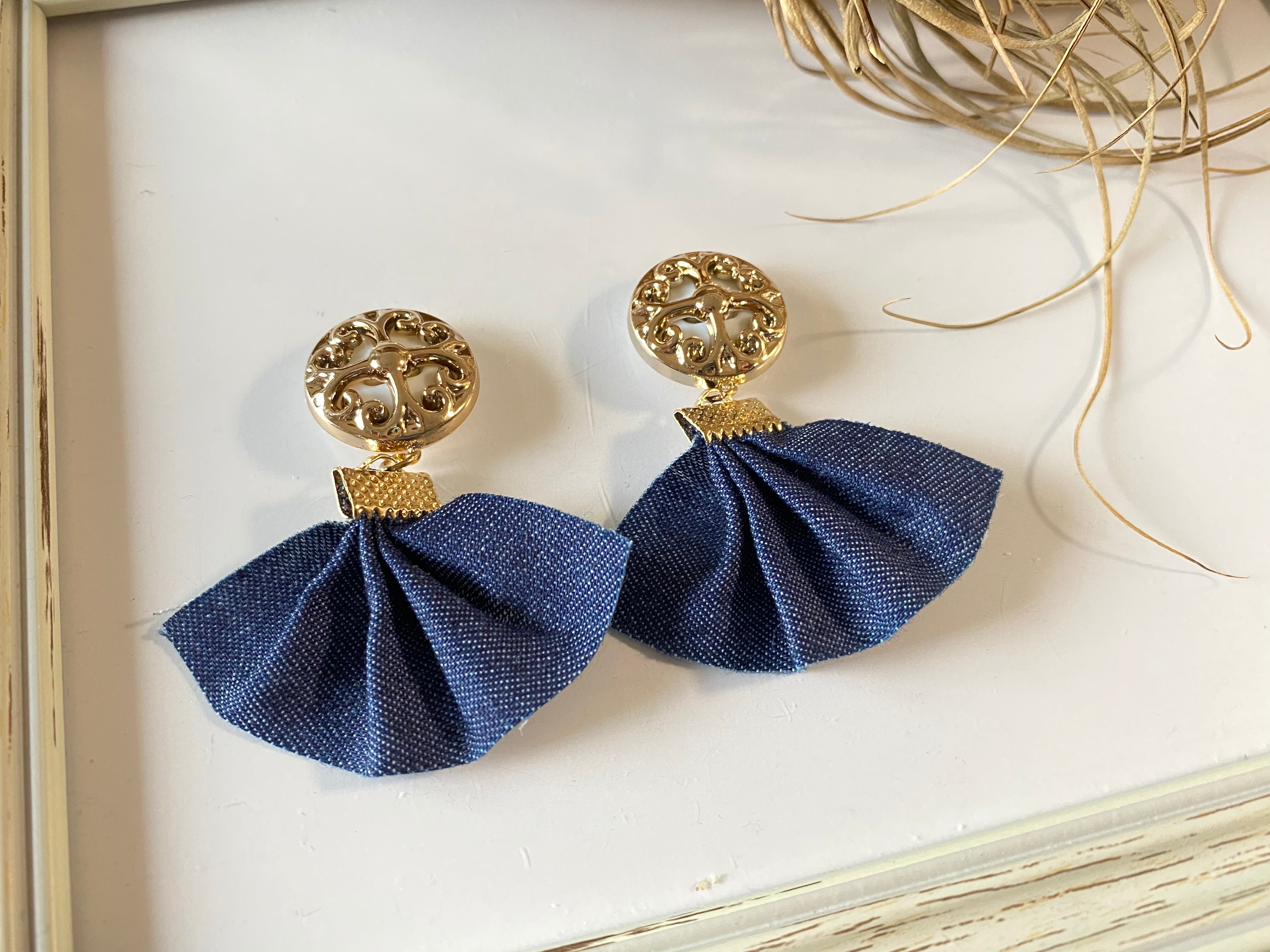 【ピアス】ビンテージ風カボション✖️デニムリボンタッセル