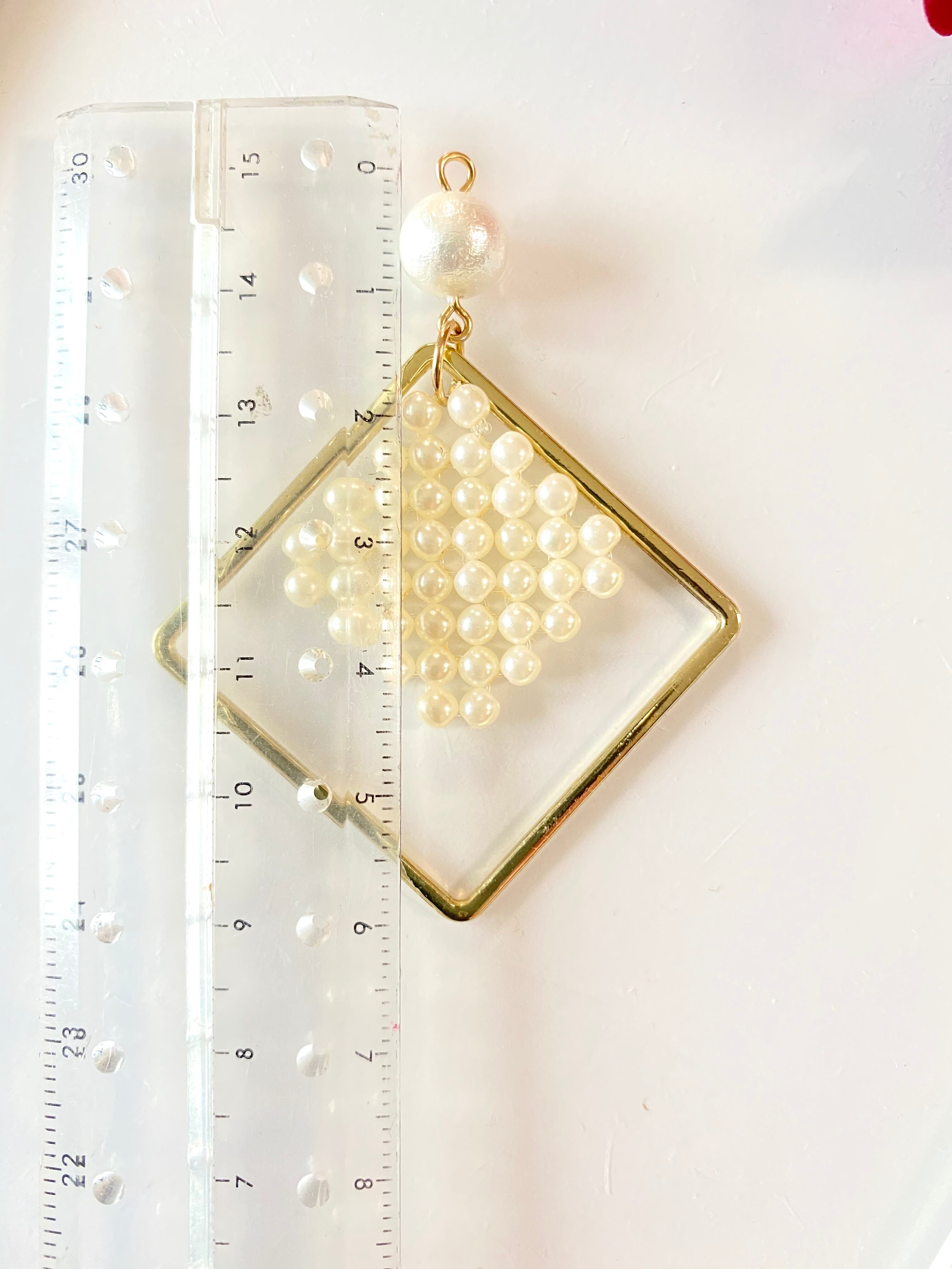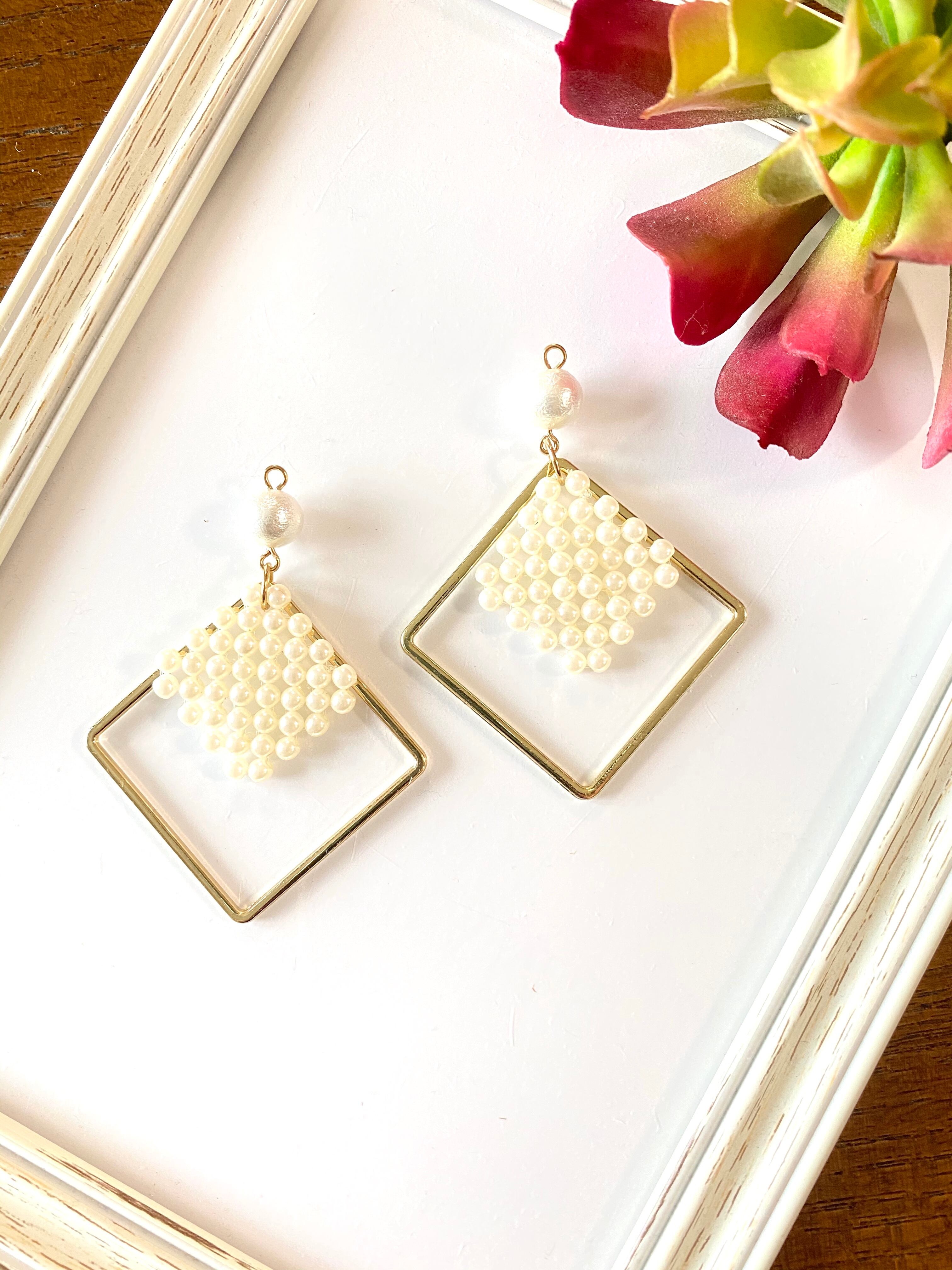 【ピアスorイヤリング】パール編みスクエア✖️コットンパール✖️ゴールド